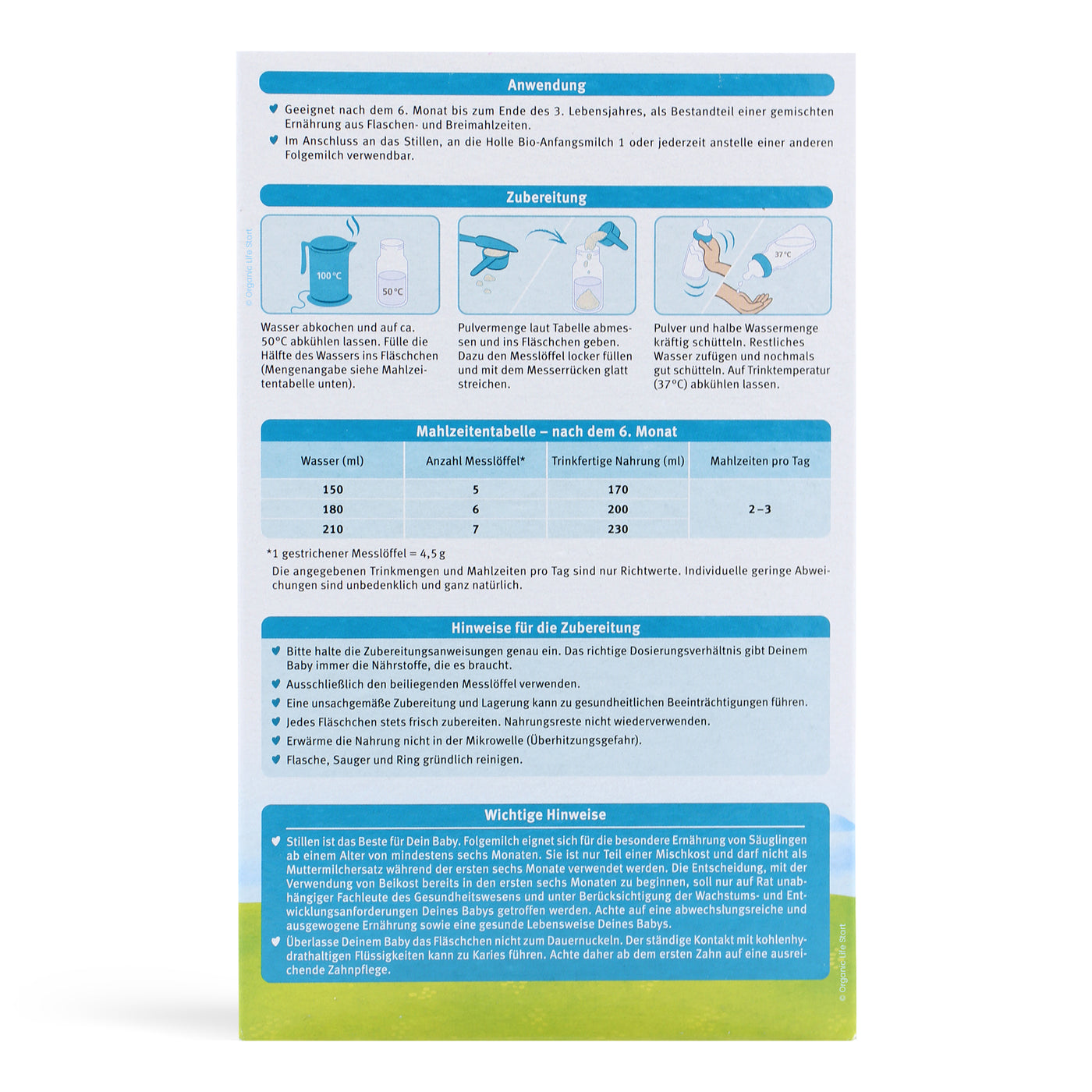 Proper preparation is essential for your baby's safety and health. You must always follow the instructions exactly. Holle Stage 2 formula is very easy to prepare: